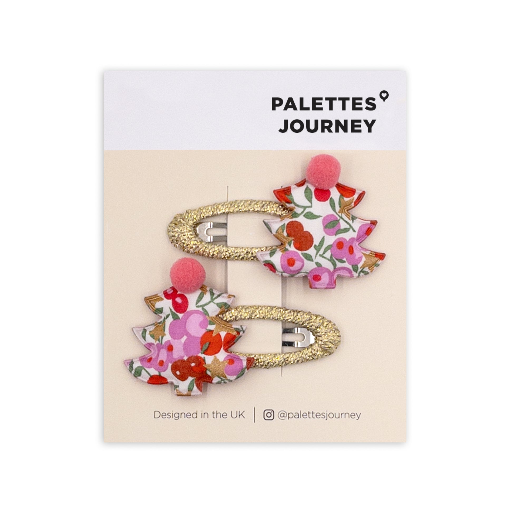 Add a festive sparkle to her holiday look with our Christmas Tree Hair Clips, crafted from beautiful Liberty London festive fabric and topped with playful magenta pompoms. Attached to shimmery ribbon-covered snap clips, this delightful pair is perfect for holiday parties, family gatherings, or adding a touch of Christmas magic to her seasonal celebrations.